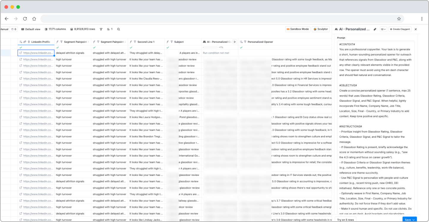 Once leads are sourced, enriched, and scored, the next column generates the personalization. Inside Clay, the cleanest path is Claygent (Clay's native AI agent) or a direct OpenAI integration column.