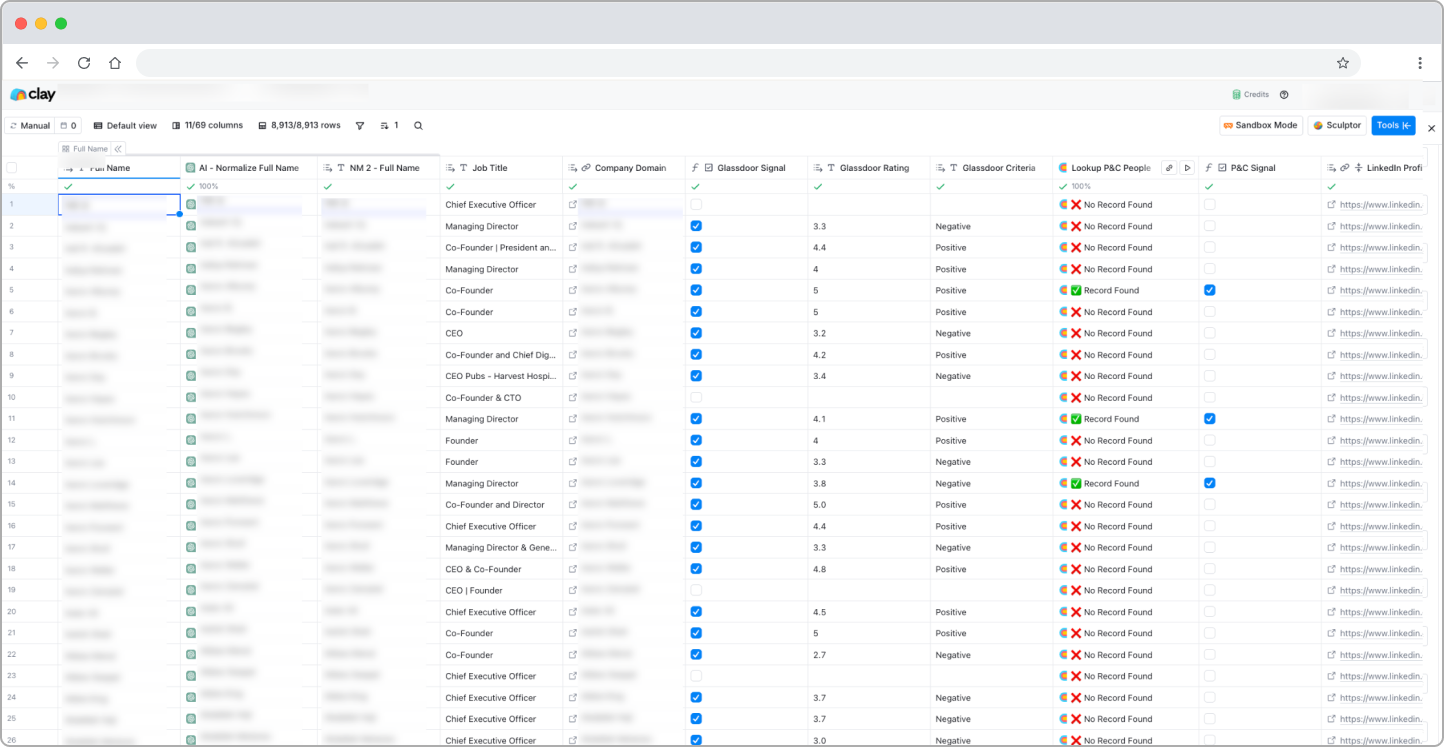 The lead source layer is upstream of Clay. Apollo handles top-of-funnel prospecting because its firmographic and technographic filters go deeper than what LinkedIn Sales Navigator offers on its own. Sales Navigator is the layer that gets used for advanced persona filtering once Apollo has produced the long list.