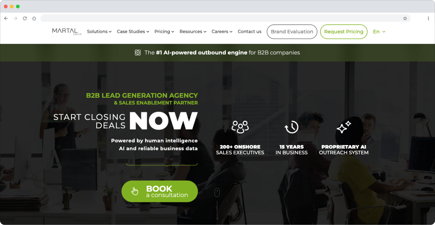 The model combines experienced human SDRs with their proprietary AI SDR platform, which handles prospecting across a large B2B database enriched with intent and technographic signals, AI-enhanced copywriting, omnichannel sequencing, and email deliverability management. Martal offers three pricing tiers: standard lead generation, deal closure plus customer onboarding, and full account management. Most campaigns begin producing qualified leads within 30 days.