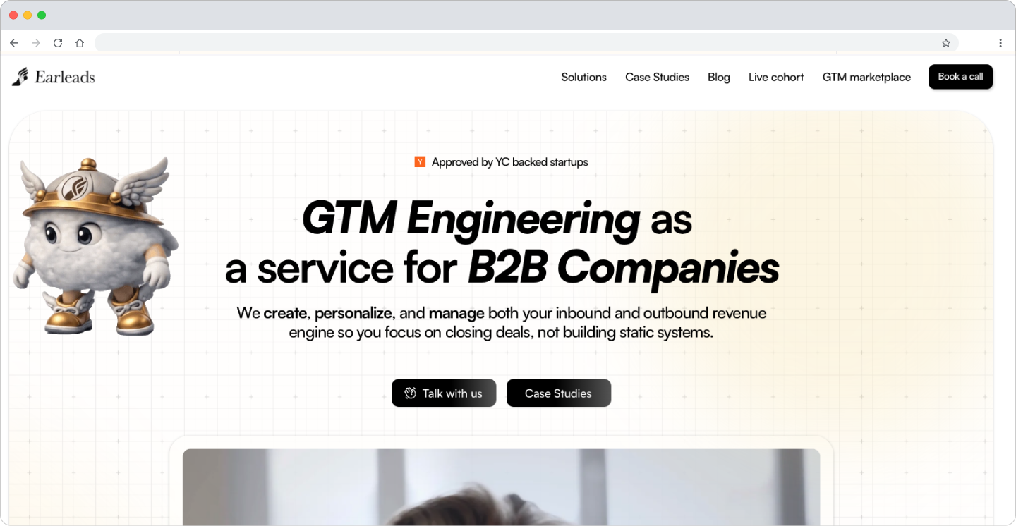 EarLeads positions itself as "GTM Engineering as a Service" rather than a traditional outbound agency, founded by Othmane and trusted by YC-backed startups. The approach is allbound — content systems, paid ads systems, and outreach systems built directly into the client's infrastructure rather than run inside the agency's tools.