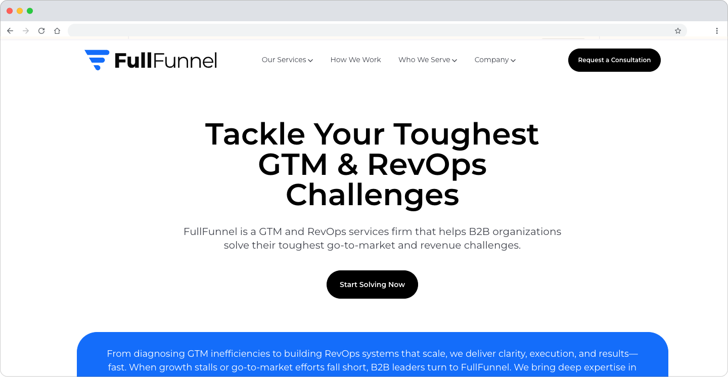 FullFunnel runs outbound combined with fractional SDR support. The model is hybrid: Clay-powered outbound systems plus actual SDRs who work replies and qualify inbound interest.